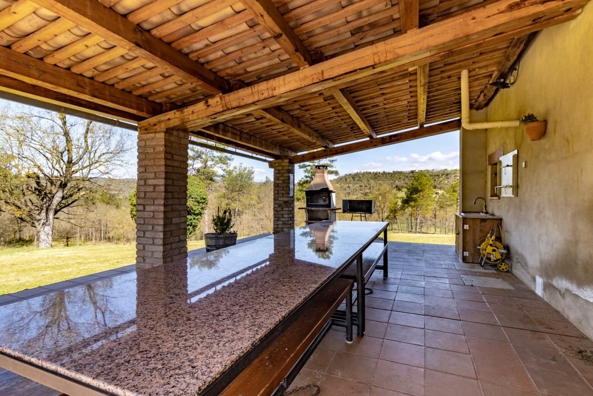 - porch with barbecue with a long table and benches