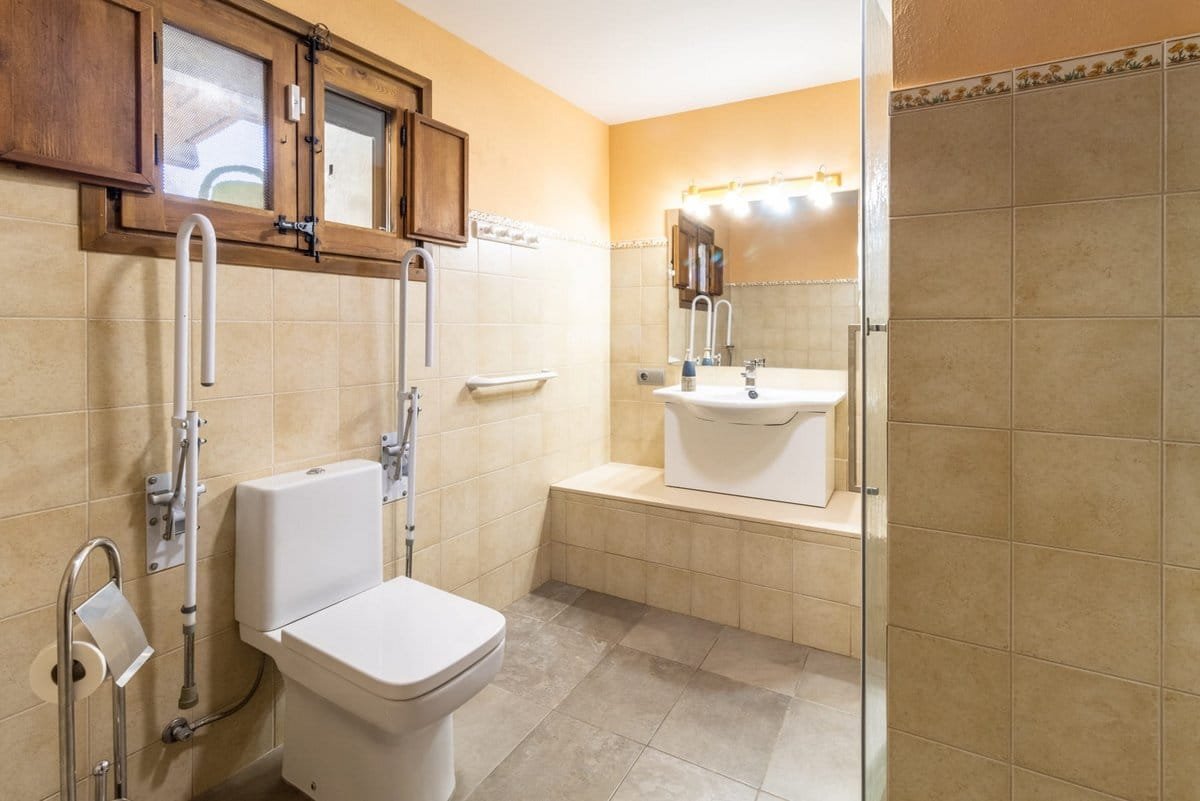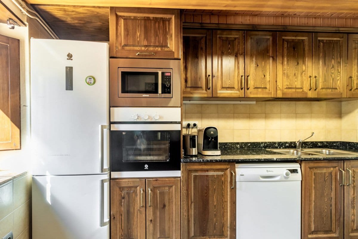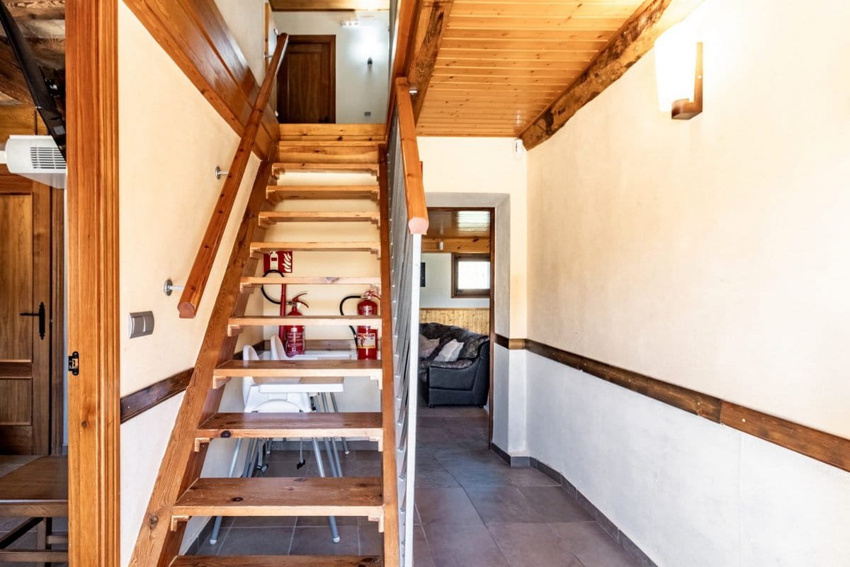 Going in through the front door, you find the stairs to the first floor with a child safety gate, and 1 bedroom with a double bed and access to a full bathroom with a shower adapted for people with reduced mobility. There is also a small utility room with a washing machine. The living room features sofas, a fireplace, and a large TV. Sharing this space is the dining area and a kitchen equipped with 2 fridge-freezers, dishwasher, oven,microwave,toaster, Nespresso coffee machine, and condiments.