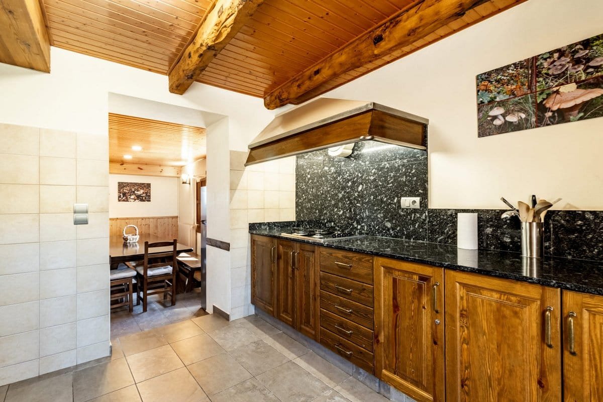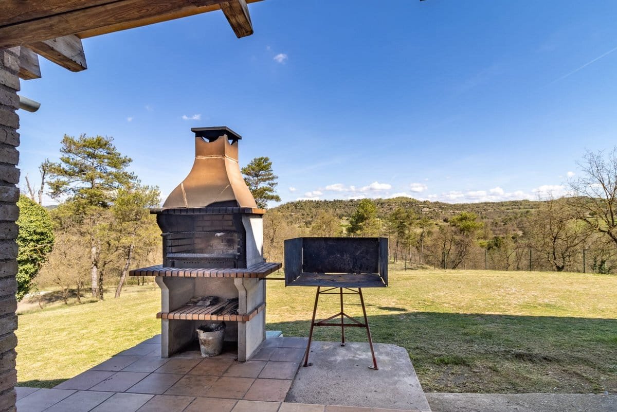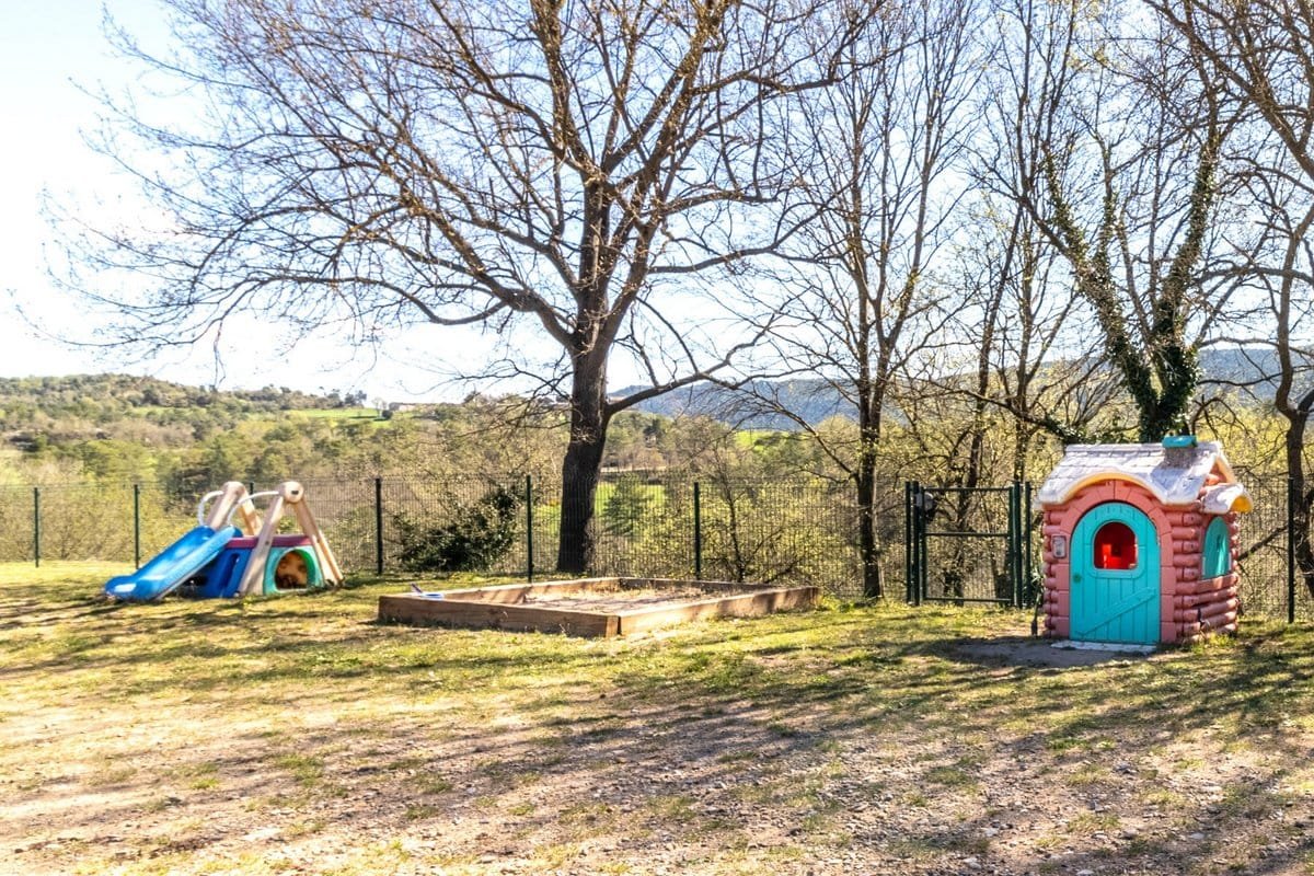The farmhouse has 5 bedrooms and 3 full bathrooms. Its outdoor spaces are ideal for relaxing, with an outdoor swimming pool, chill-out area, barbecue, and outdoor dining area. There is also a children’s play area with a trampoline and sandbox. The facilities offer complete privacy and all the necessary amenities for a pleasant stay.