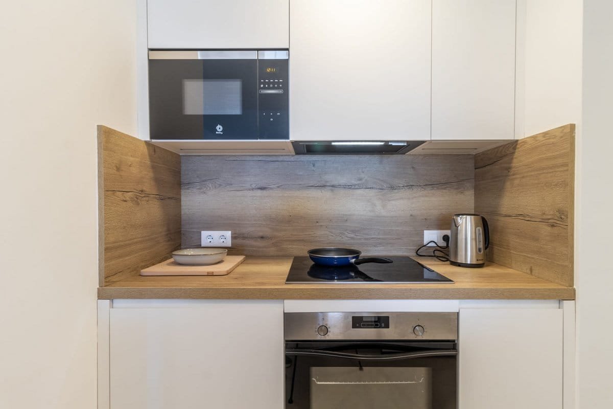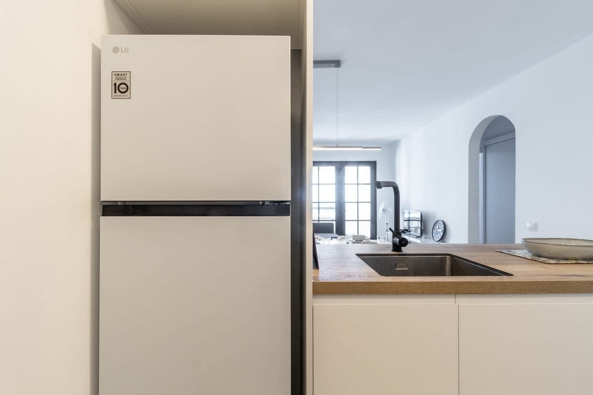 • Kitchen equipped with a fridge, oven, vitroceramic hob, microwave, dishwasher, coffee maker and tableware.