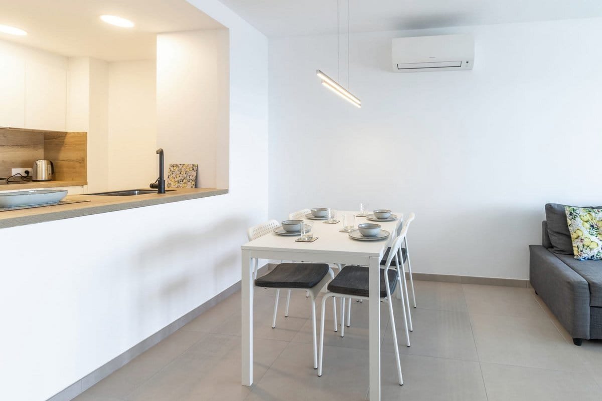 The apartment has an open-plan area where there is a kitchen equipped with a fridge, oven, vitroceramic hob, microwave, dishwasher, coffee maker, toaster and tableware. The lounge-dining room has a table, chairs, chaise longue sofa and TV, and leads to the outside balcony. Air conditioning unit.