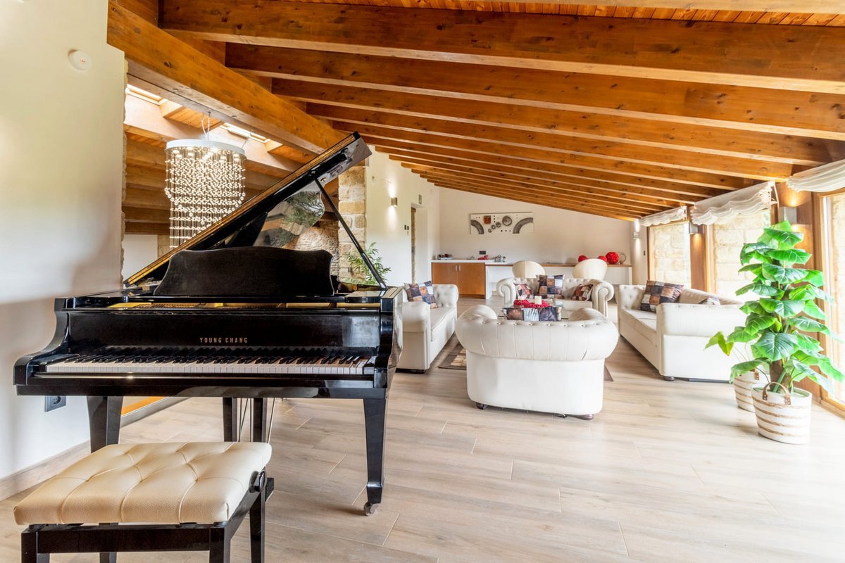 - 3 living rooms: with sofas and armchairs, TV, coffee tables and other furniture, fireplace, piano, bookshelves.