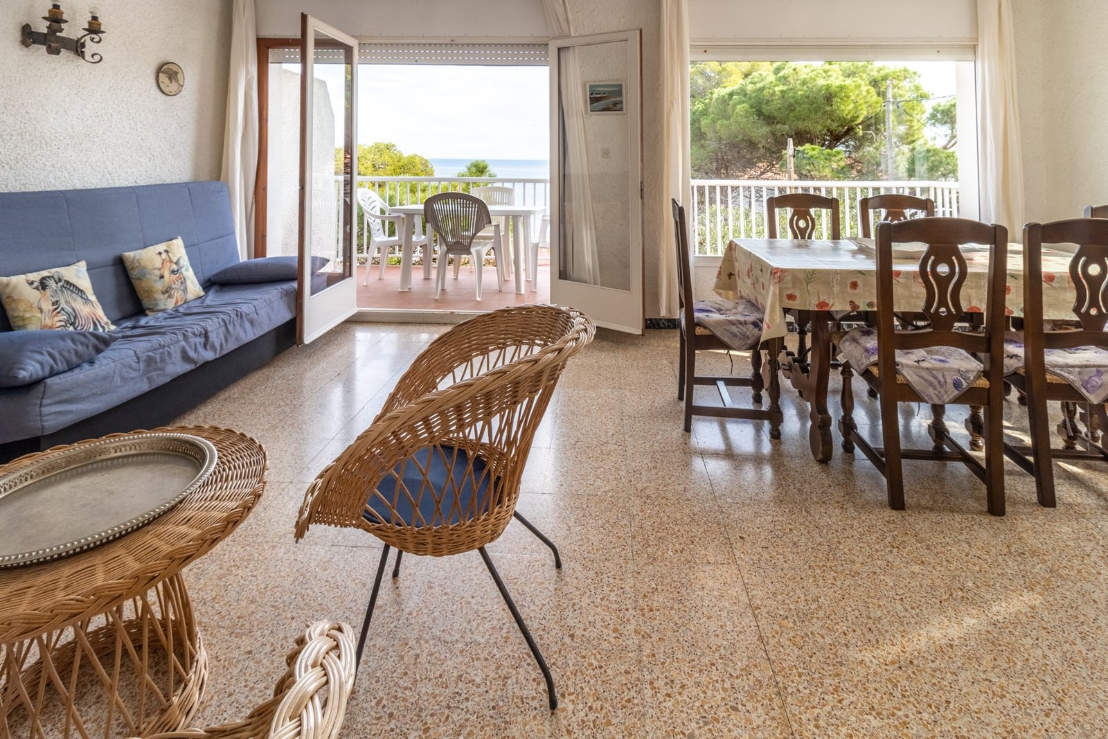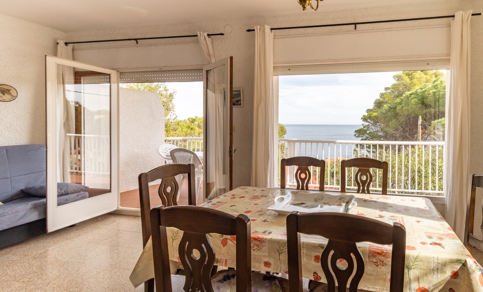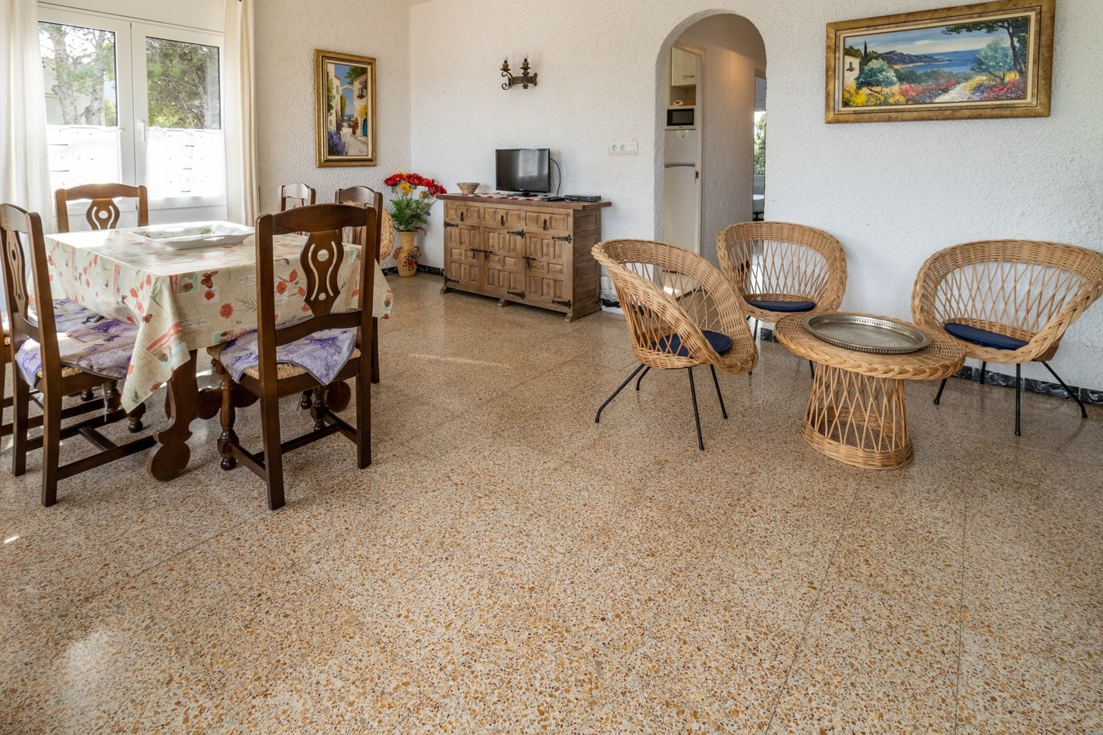Cal pujar una escala per arribar a l’apartament, l’espai es distribueix en una sola planta. El menjador-sala d’estar és gran i té una taula de fusta i 6 cadires, sofà, cadires i tauleta de vímet, moble amb TV, llar de foc decorativa i finestres grans que deixen entrar la llum natural i donen accés a la terrassa amb vistes molt boniques al mar. La cuina està equipada amb nevera, forn, fogons, microones, cafetera de filtre, torradora i vaixella.