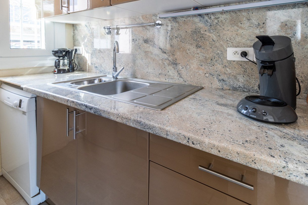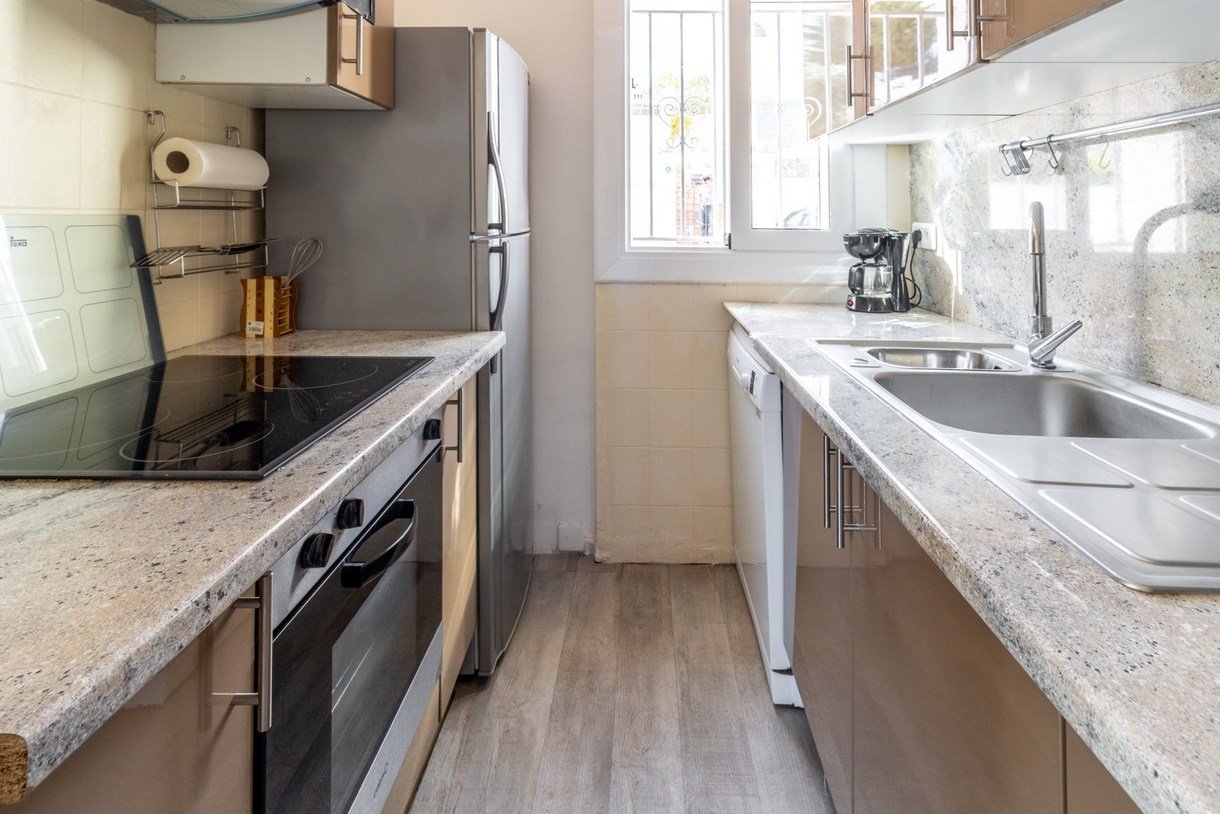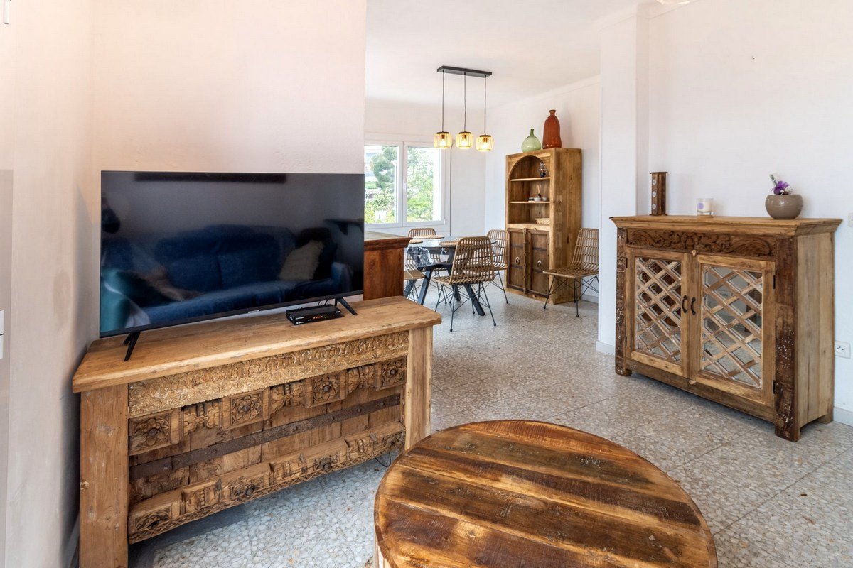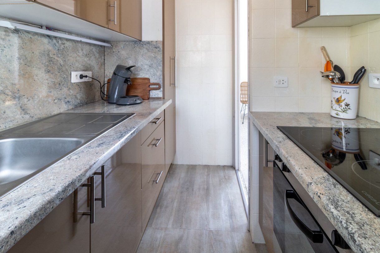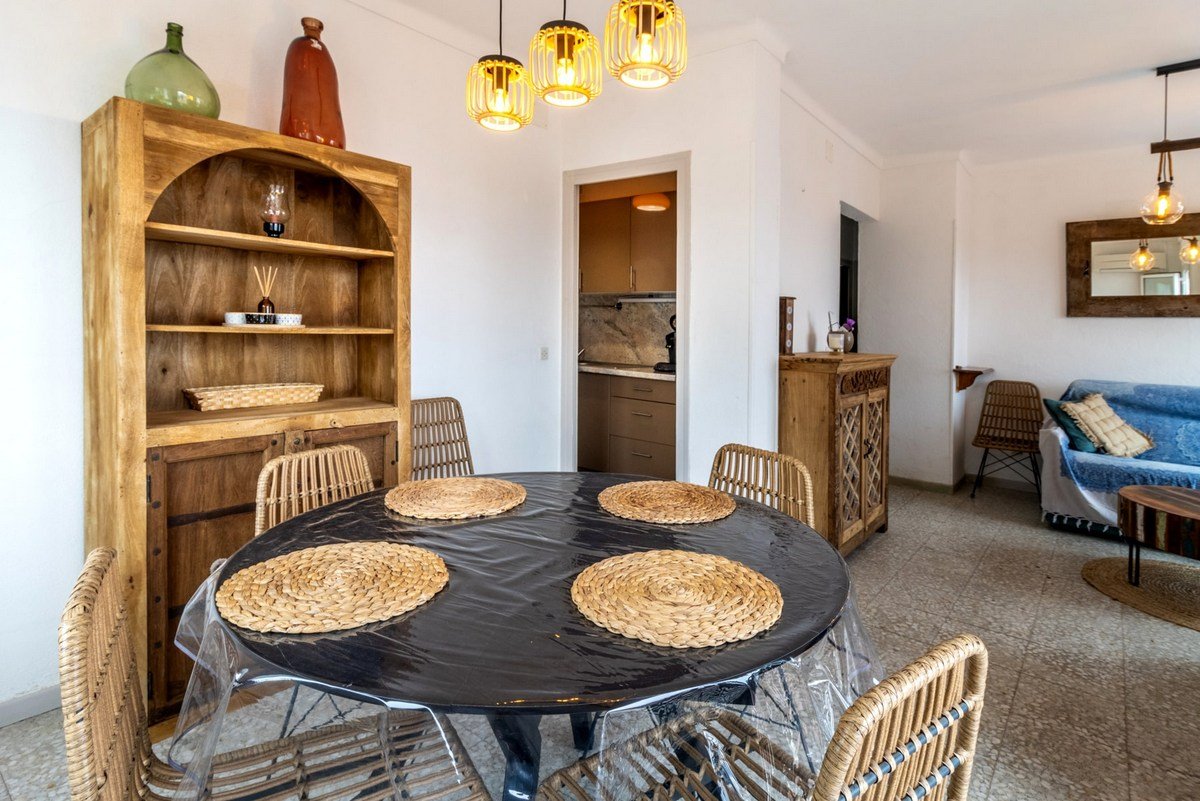 En entrar a l’apartament, hi ha un espai obert i lluminós que inclou cuina americana i saló-menjador amb taula de fusta i 6 cadires, sofà i 2 butaques, taula central i TV. La cuina està equipada amb nevera-congelador, cuina, mini forn-grill, cafetera de filtre i vaixella. A més, s’hi inclouen aspiradora, planxa i taula de planxar.