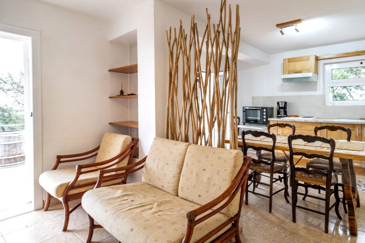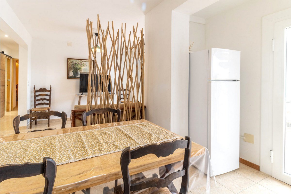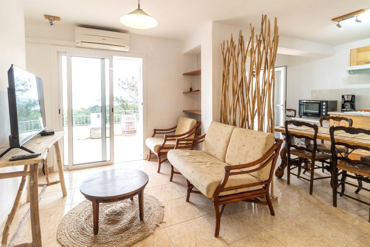 Per arribar a l’apartament de planta baixa per a 4 persones, cal baixar una escala a tocar de la casa que condueix a una àmplia terrassa amb porxo ombreig i mobles d’exterior.
